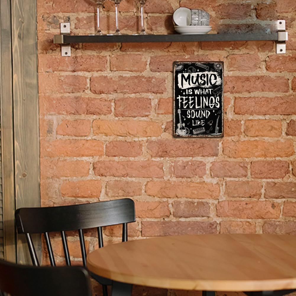 Music Instruments Metal Sign: The metal sign pattern features black as the background color and includes some musical instruments. The simple stroke style paired with “MUSIC IS WHAT FEELINGS LIKE” makes it suitable as a decoration for music rooms and also as a gift for music lover.