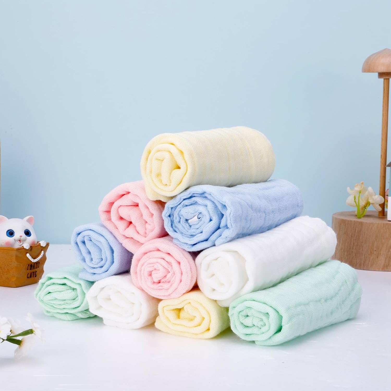 Set: Contains 10 pure cotton muslin cloths, 5 colors in total, 2 of each color, the colors are pure white, sky blue, light green, light pink, light yellow, the size is approximately 25×25 cm/9.84 x 9.84 inches